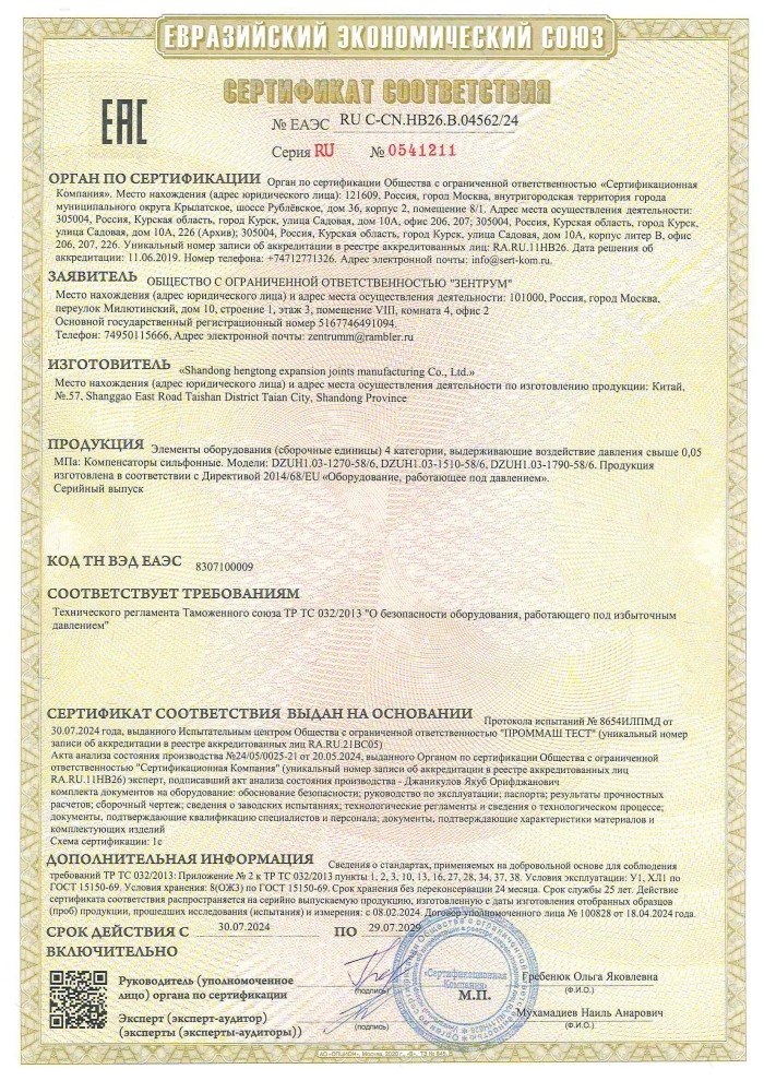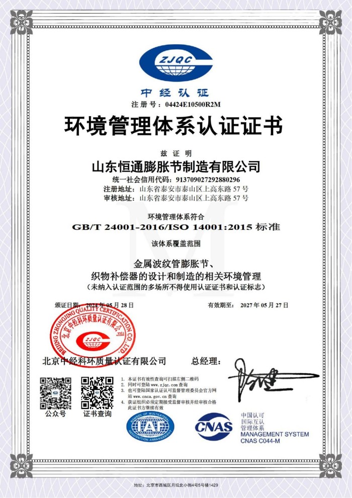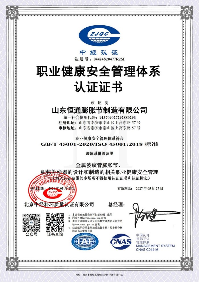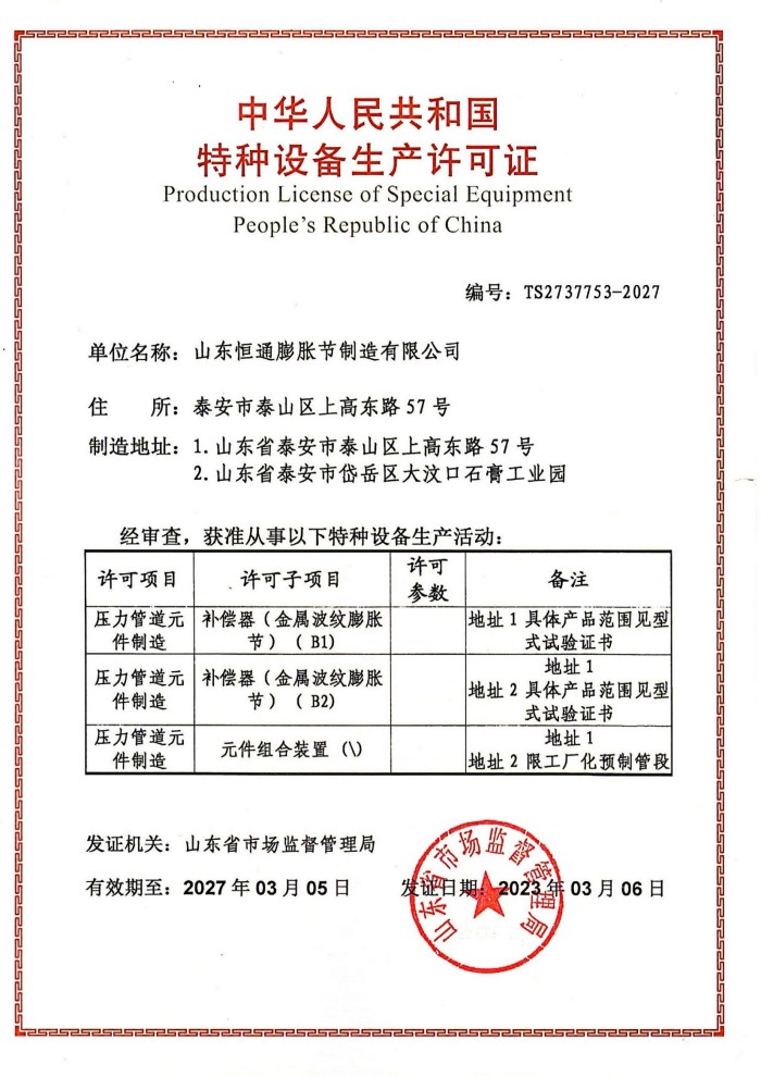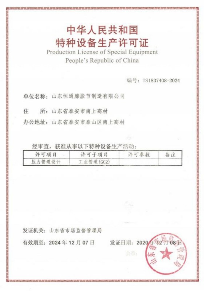 山東恒通膨脹節制造有限公司是一家集研發、設計、制造、銷售和服務于一體的大型膨脹節制造企業。公司取得我國特種設備制造許可證、壓力容器A1級資質、壓力管道元件A、B的資質,并且獲得了歐盟PED-CE認證、美國ASME“U”鋼印、ISO 9000質量管理體系認證、GB/T 14000 環境管理體系認證及GB/T 45000 職業健康安全體系認證。膨脹節產品涵蓋壓力管道波紋膨脹節、壓力容器波形膨脹節、金屬波紋管、金屬軟管...